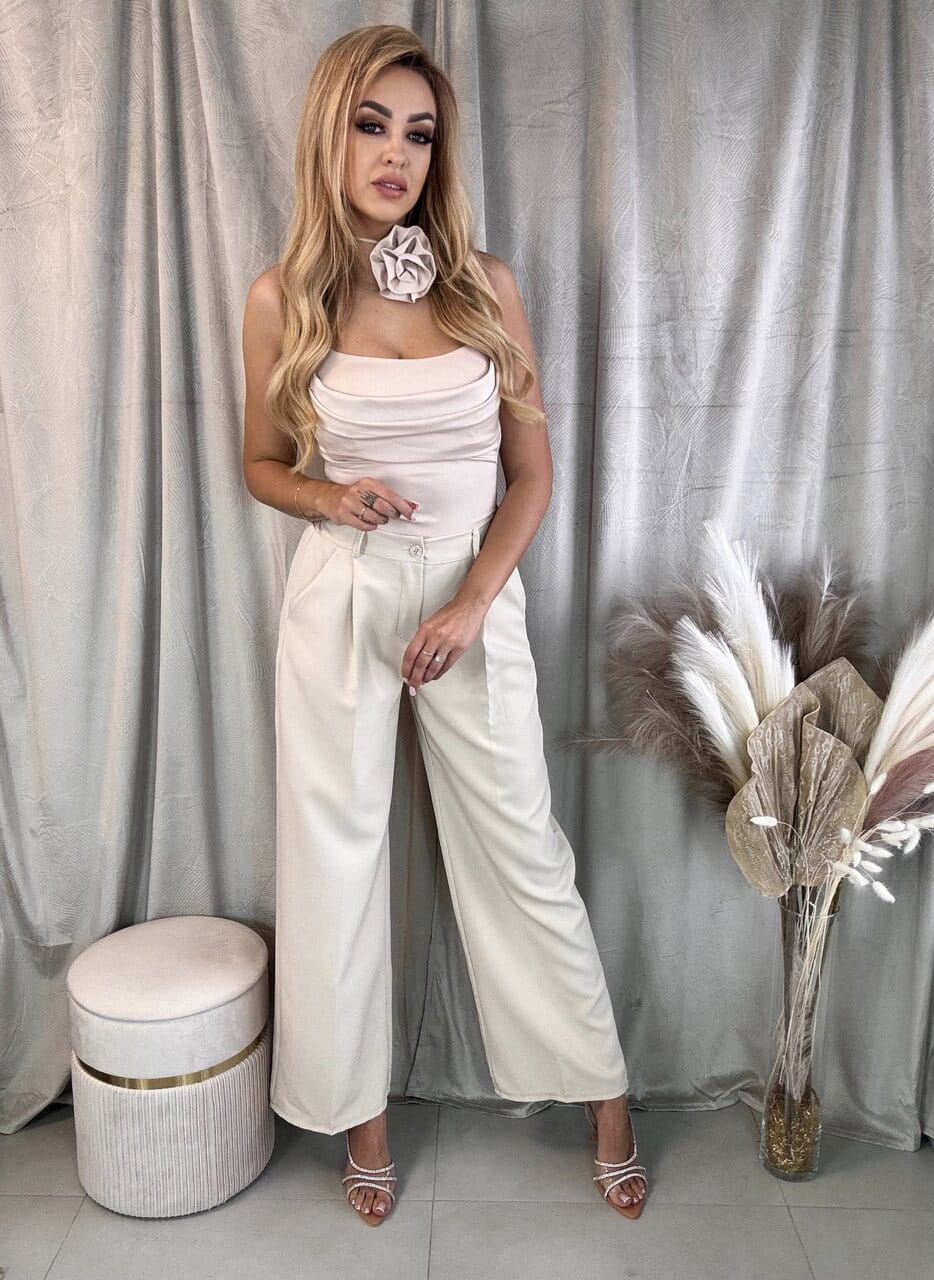 Zaktualizuj swoją garderobę, dzięki temu eleganckiemu i wyrafinowanemu kompletowi. Ten szykowny strój łączy w sobie dopasowane body na ramiączkach, spodnie o szerszym kroju, oraz choker wiązany na szyji, prezentujący dużą różę 3D.