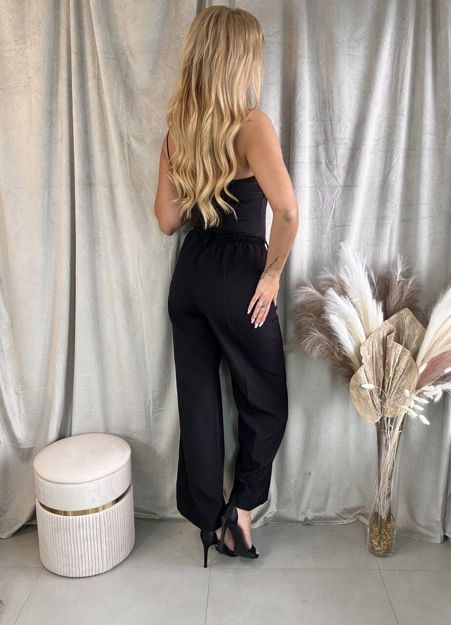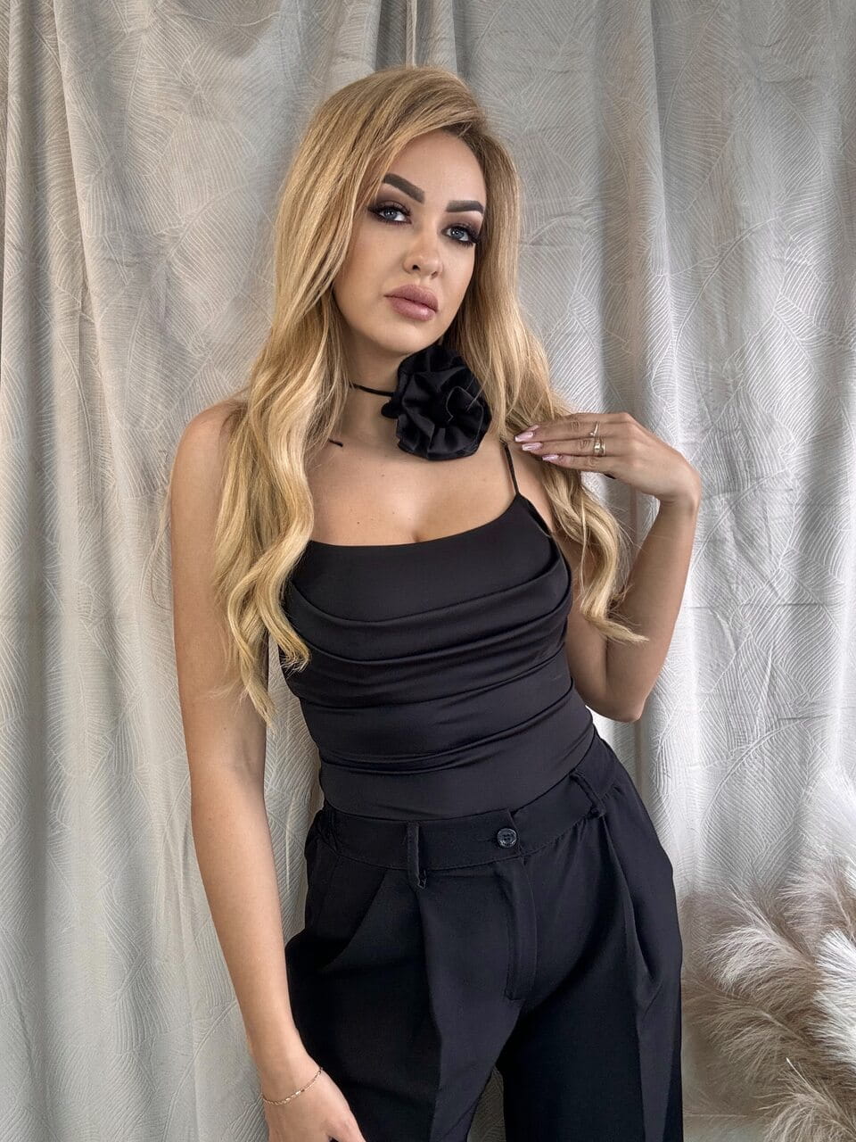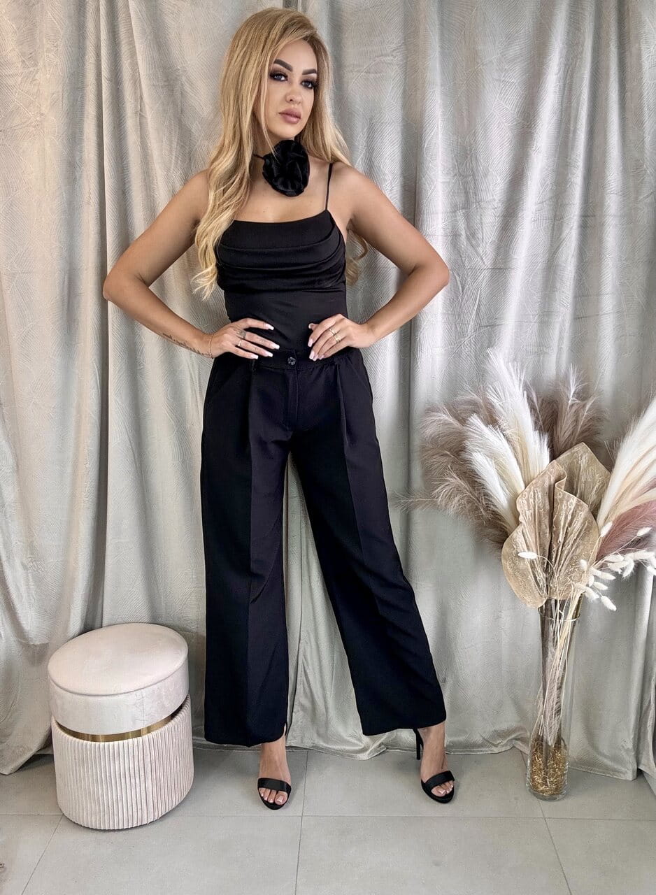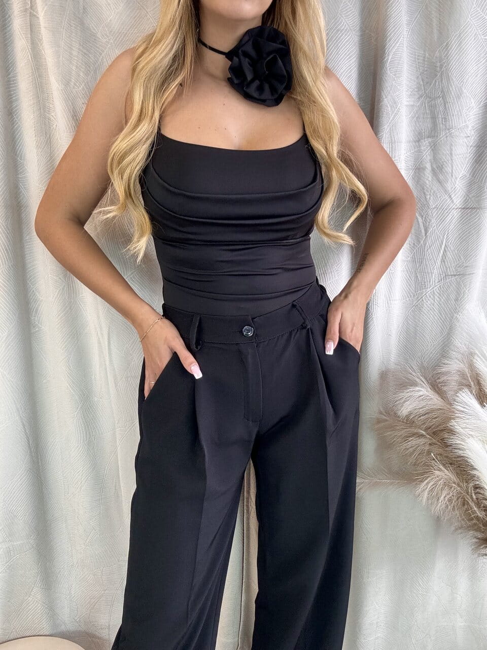Zaktualizuj swoją garderobę, dzięki temu eleganckiemu i wyrafinowanemu kompletowi. Ten szykowny strój łączy w sobie dopasowane body na ramiączkach, spodnie o szerszym kroju, oraz choker wiązany na szyji, prezentujący dużą różę 3D.